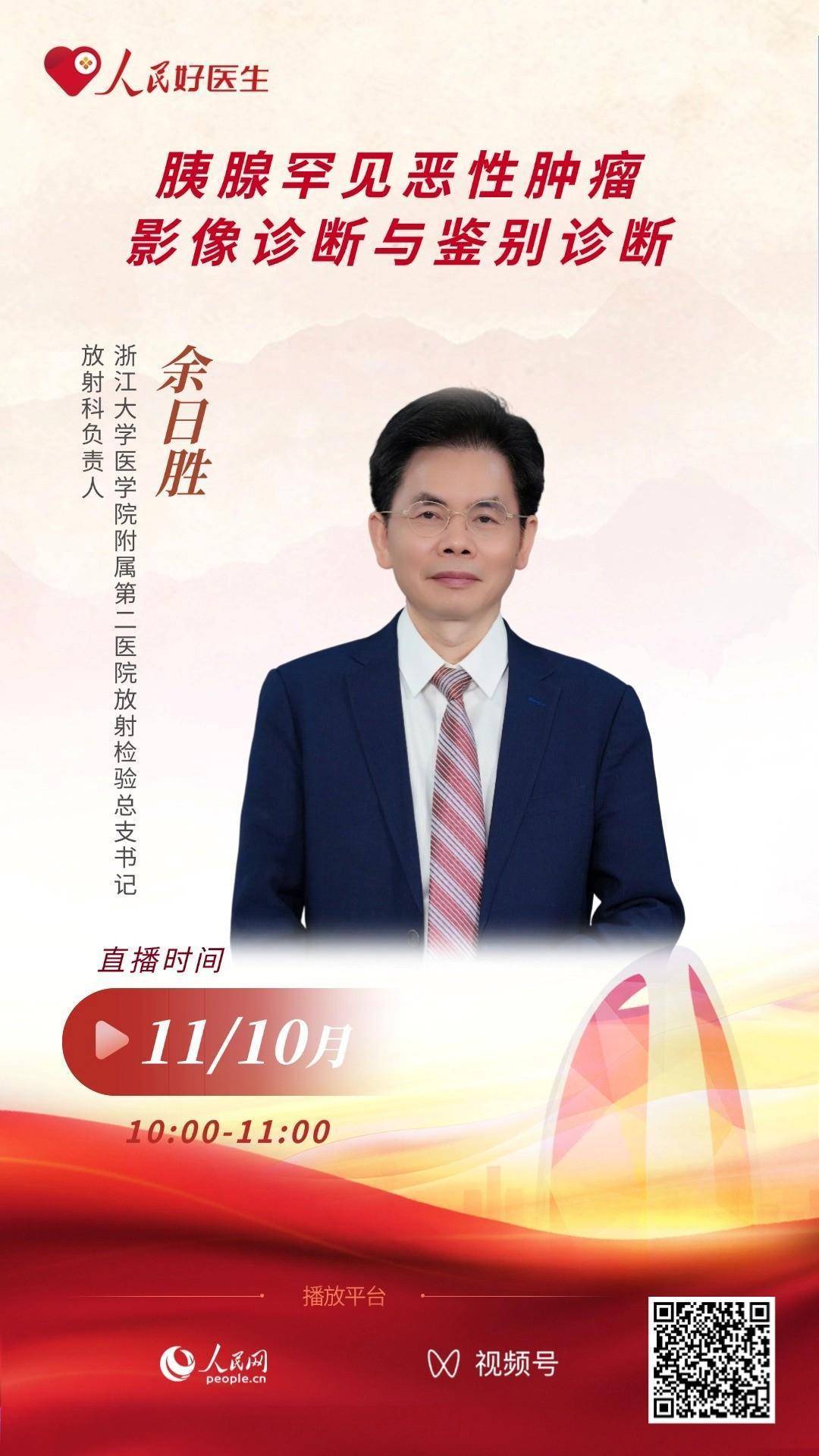 10月11日(周六)10:00-11:00,浙江大学医学院附属第二医院放射检验总支书记、放射科负责人余日胜做客“人民好医生”直播间,与大家一起分享如何通过影像学检查实现这类肿瘤的早期精准诊断,欢迎届时收看。